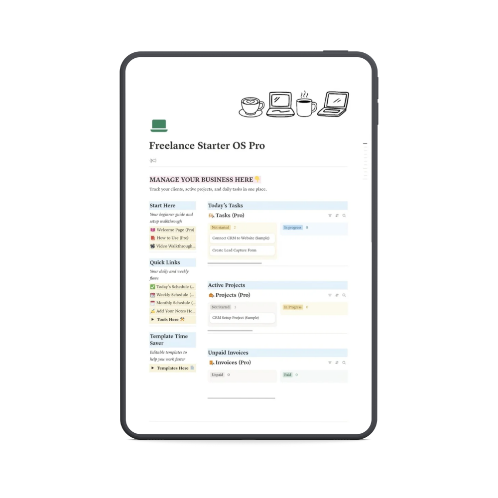 Freelance Starter OS Pro gives you a clear structure for managing your clients, tasks, projects, and income.