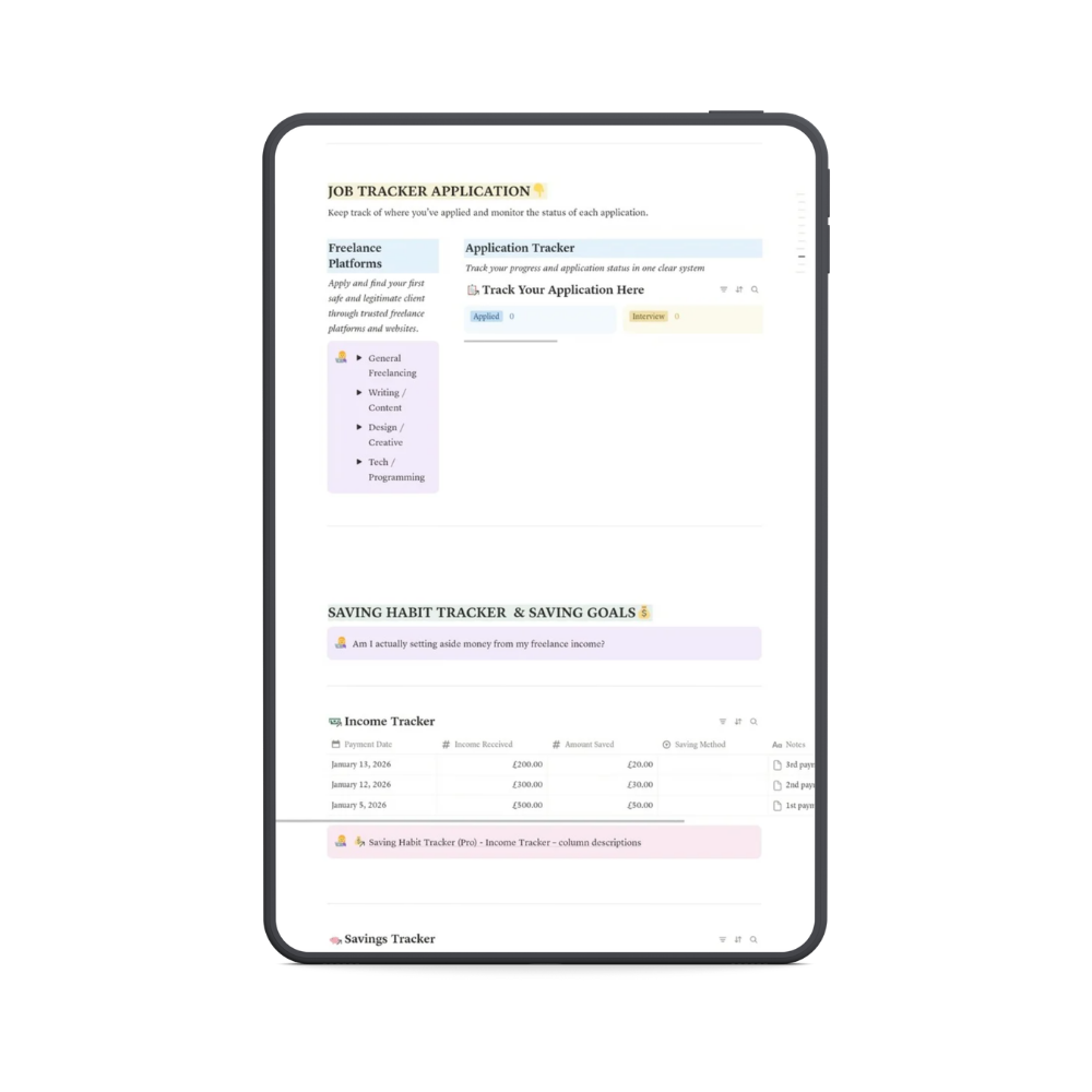 Freelance Starter OS Pro works inside Notion, a simple workspace where you can organize your projects, tasks, notes, track your applications, monitor your freelance earnings, and databases in one place. Many freelancers use it to manage their work because it is flexible and easy to customize.